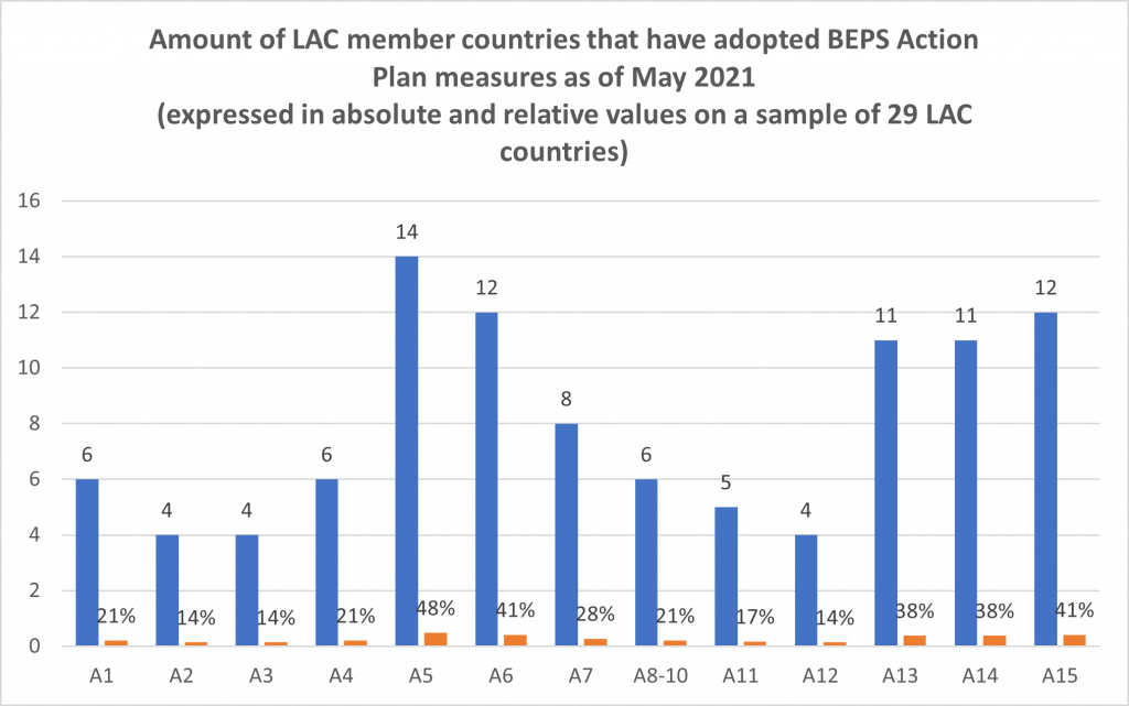 Figure 2. Number of LAC member countries (from the sample of 29) that implemented BEPS Action Plan measures as of May 2021. The blue bars represent the number of countries that implemented these actions in absolute values and the orange bars represent the same information in relative values, considering the total number of LAC countries in the sample.