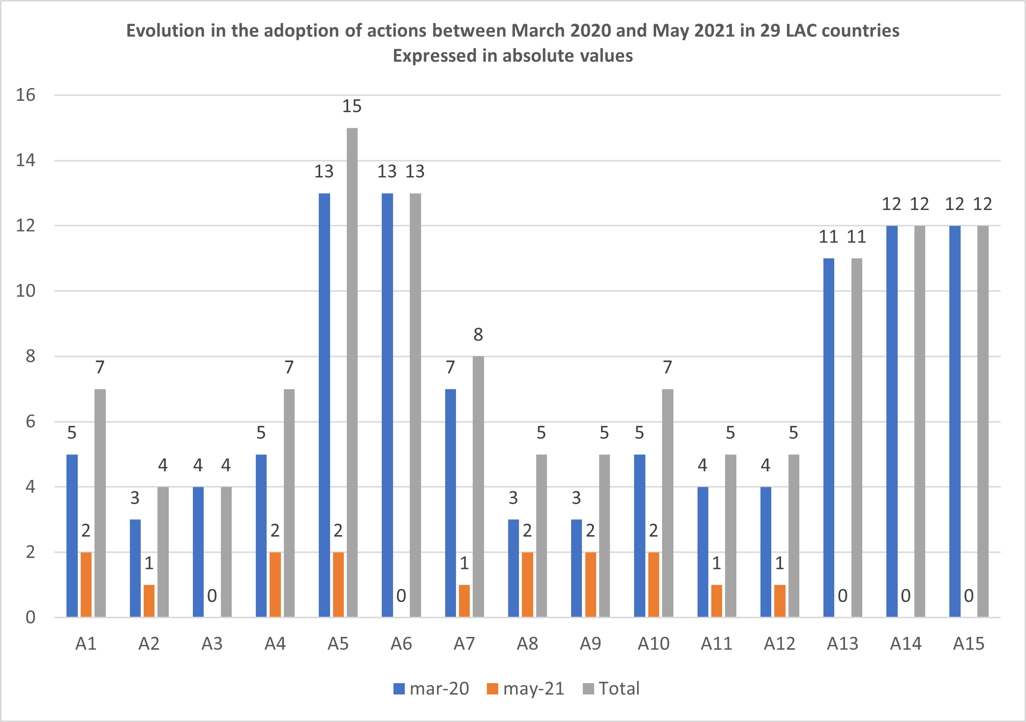 Figure 3. Evolution in the adoption of actions between March 2020 and May 2021 in 29 LAC countries. The blue bars show the number of countries that adopted actions before March 2020, the orange bars show the number of countries that have adopted actions between March 2020 and May 2021 and the grey bars show the total actions adopted, as of May 2021.