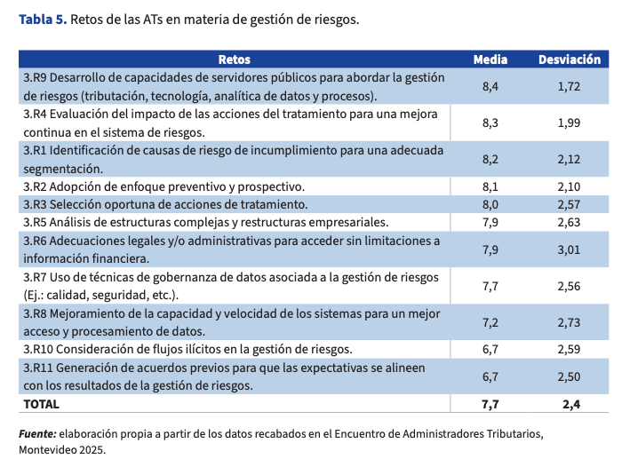 El documento Oportunidades y Desafíos de las AT (CIAT, 2026)[2], recoge en su tabla 5 los principales retos identificados y su ordenación por valoración (media total 7,7; desviación 2,4).