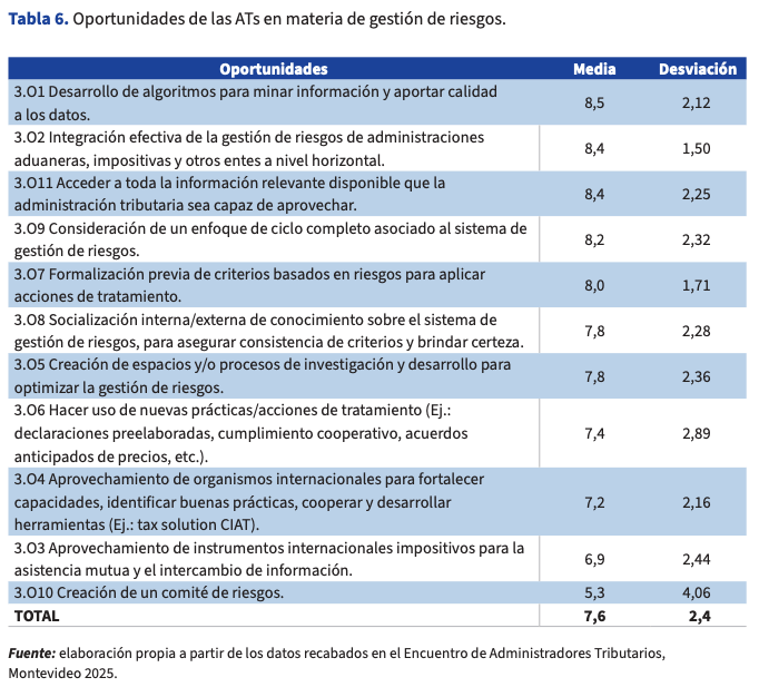 En cuanto a las oportunidades en materia de gestión de riesgos, la Tabla 6 del antes referido documento del CIAT muestra las conclusiones obtenidas, siendo la media total de 7,6 y la desviación de 2,4.