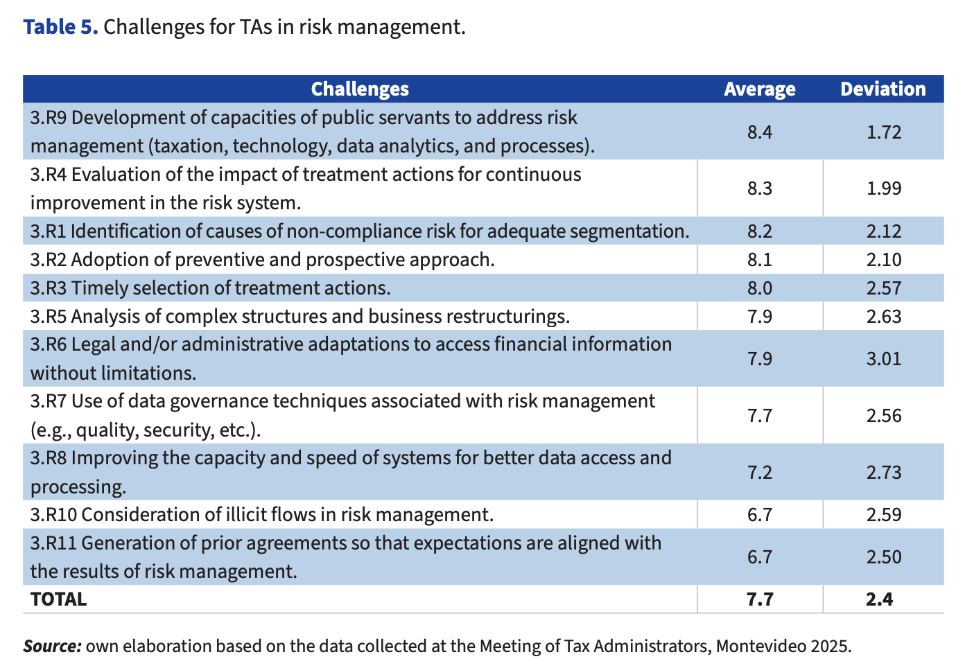 It can be seen from this table that, despite technological advances and forecasts about a lower dependence on personnel, as a result of the use of artificial intelligence, having adequate and sufficient human resources is the main challenge faced by tax administrators. In this sense, it is strategic for TAs to allocate more resources to staff development, especially in the areas of taxation, technology, data analytics, and process management. Personnel remains the main asset of TAs and one of the biggest concerns of tax administrators.