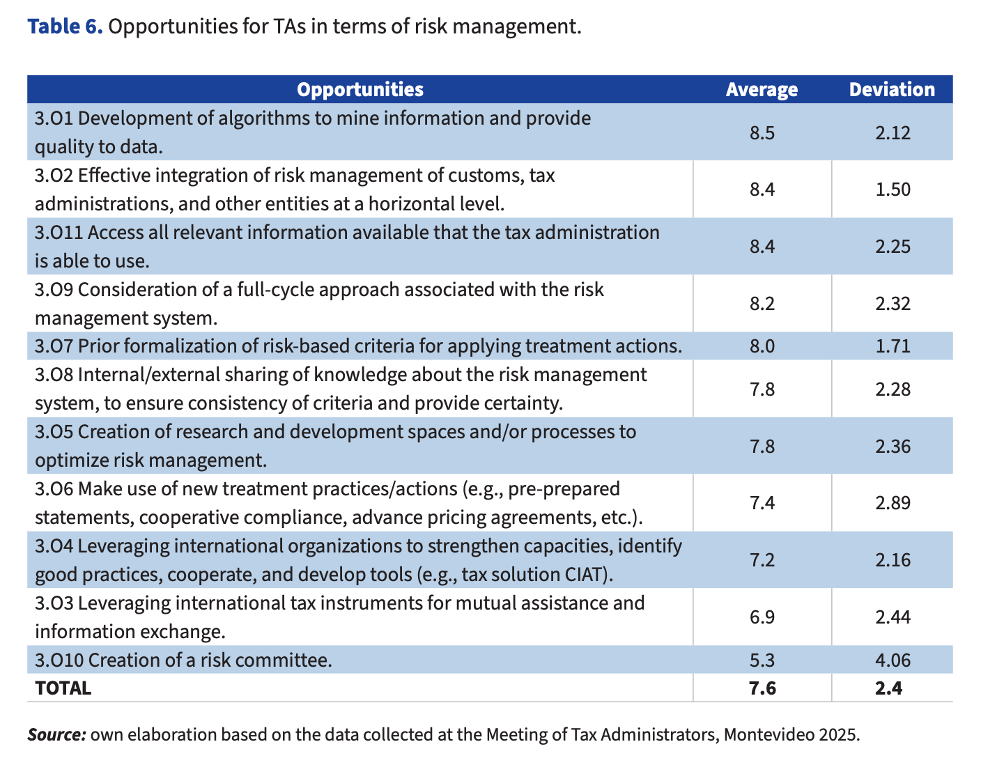 Two opportunities that were valued in similar proportions (average of 7.8) and with a similar level of consensus (deviations of 2.28 and 2.36) were the internal/external socialization of knowledge about the risk management system and the creation of spaces and/ or research and development processes. Both aspects are fundamental to ensure that a TA is consistent in the application of criteria and provides sufficient certainty to taxpayers.
