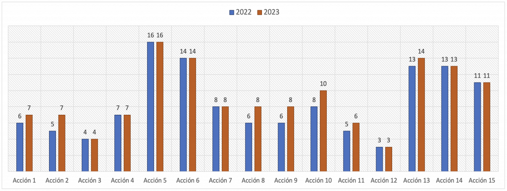 The BEPS Monitor contains data on the situation of a selection of 37 CIAT member countries regarding the adoption of measures inspired by the recommendations of the BEPS Action Plan. In Foz do Iguacu, data corresponding to September 2023 were presented for a selection of 19 countries in Latin America and the Caribbean. The vast majority of these countries are part of the BEPS Inclusive Framework and have adopted the recommendations of the minimum standard, which involves Actions 5, 6, 13 and 14. Likewise, the BEPS Monitoring shows the interest of many countries in the region in adopting measures inspired by optional actions, in particular those related to the control of transfer pricing (Actions 8, 9 and 10), the control of transactions involving hybrids (Action 2), the deductibility of financial components (Action 4), the control of artificial avoidance of the permanent establishment status (Action 7) and the adoption of methodologies to collect and analyze data on base erosion and profit shifting (Action 11). The following graph shows, for 19 countries in Latin America and the Caribbean, the evolution between 2022 and 2023 of the measures inspired by the BEPS Action Plan.