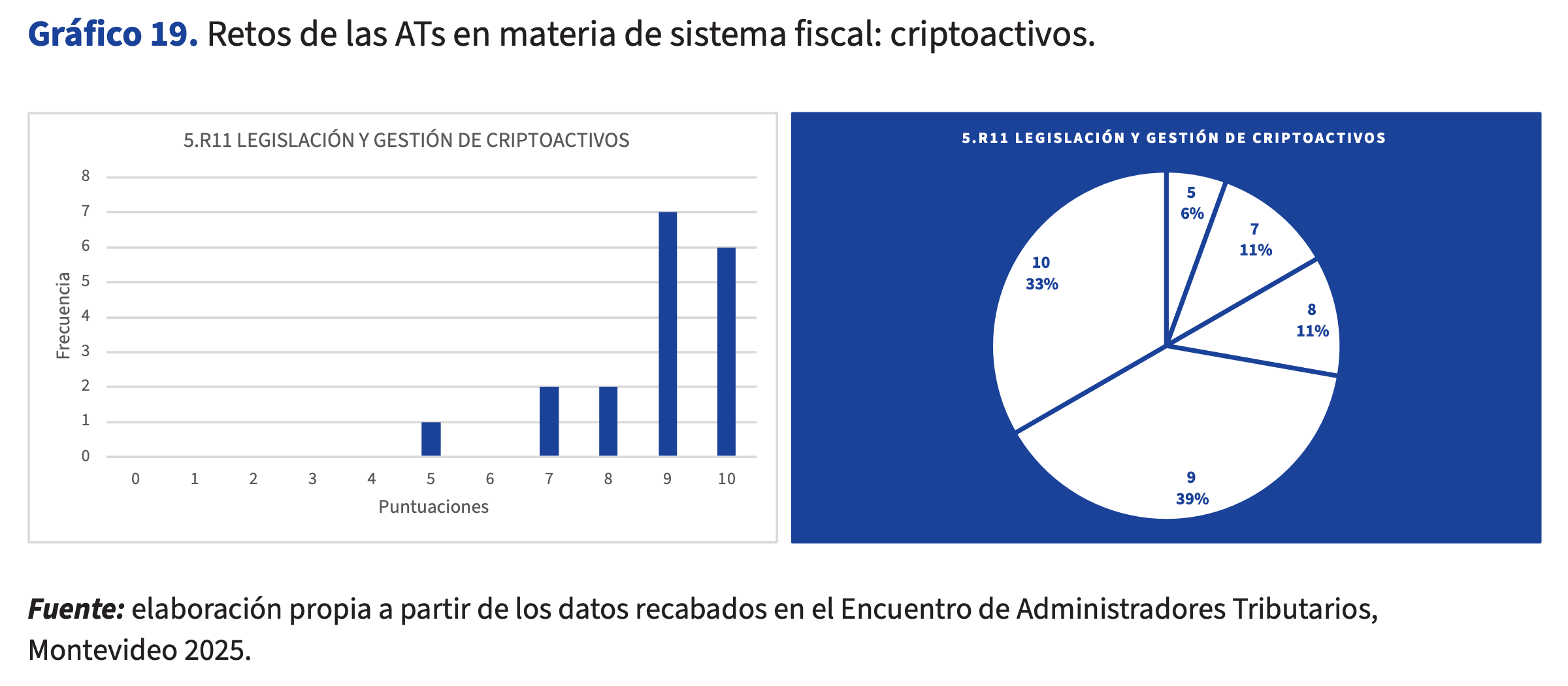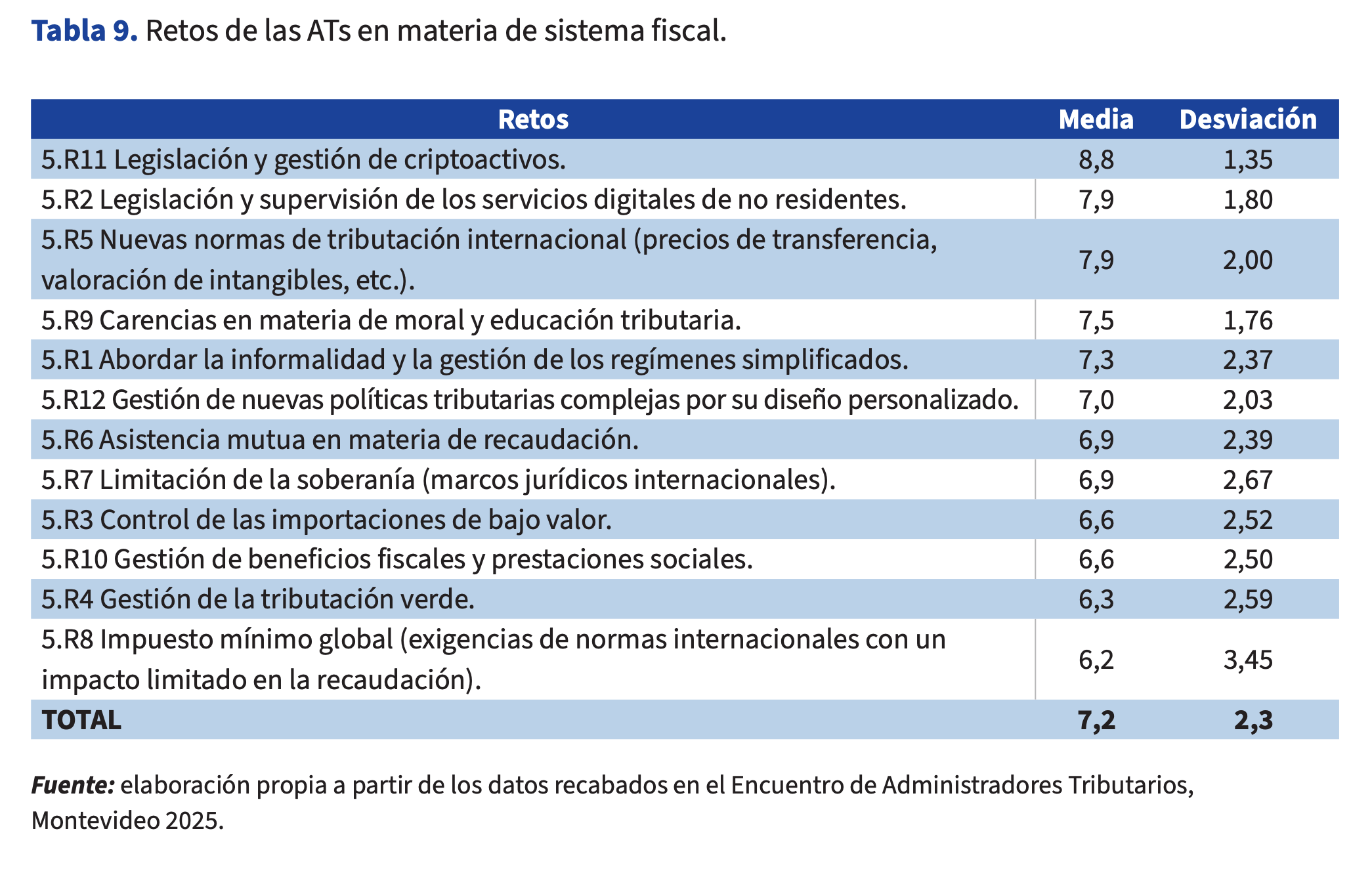 Los retos más relevantes en este campo aparecen en la Tabla 9 (media 7,2; desviación 2,3) con la siguiente ordenación: legislación y gestión de criptoactivos; legislación y supervisión de los servicios digitales de no residentes; nuevas normas de tributación internacional; carencias en materia de moral y educación tributaria; la informalidad y la gestión de los regímenes simplificados; gestión de nuevas políticas tributarias complejas por su diseño personalizado; asistencia mutua en materia de recaudación; limitación de la soberanía (marcos jurídicos internacionales); control de las importaciones de bajo valor; gestión de beneficios fiscales y prestaciones sociales; gestión de la tributación verde; impuesto mínimo global.