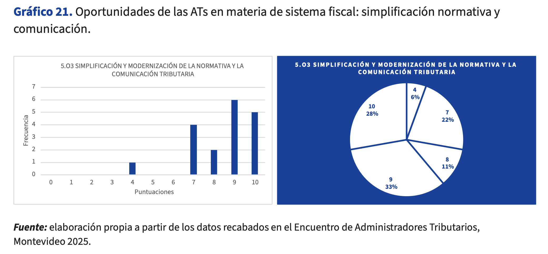 Se observa cómo la aproximación de las ATs al sistema fiscal se fundamenta en facilitar el paradigma del cumplimiento voluntario utilizando todas las herramientas a su alcance, siendo la simplificación de la normativa y de la comunicación tributaria la que encabeza el listado de oportunidades, con una puntuación de 8,4 y un alto grado de consenso (Gráfico 21).