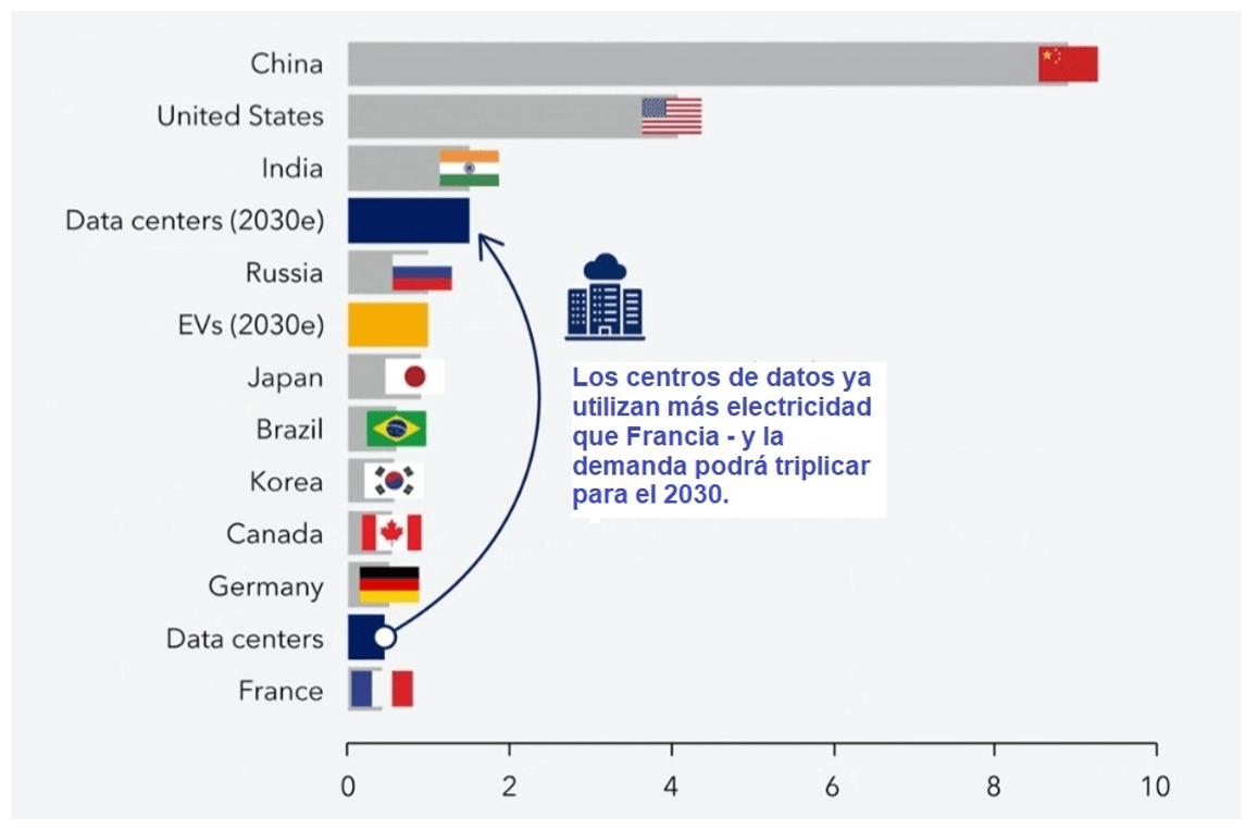 En 2023, conforme la Figura 1, todos los centros de datos combinados utilizan tanta energía como algunas de las economías más grandes del mundo. Para 2030, estimulado principalmente por la IA, la demanda global de electricidad para los centros de datos superará la demanda total de países como Rusia, Brasil y Japón.