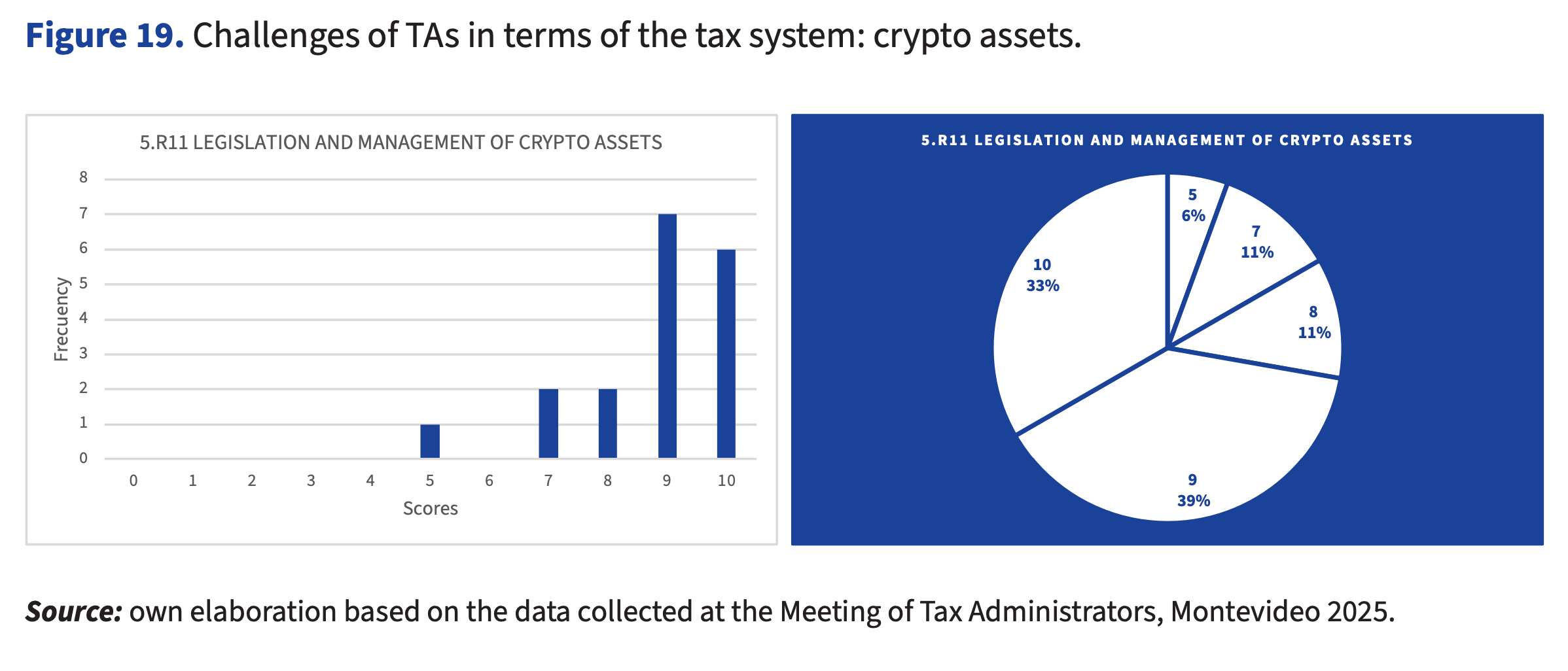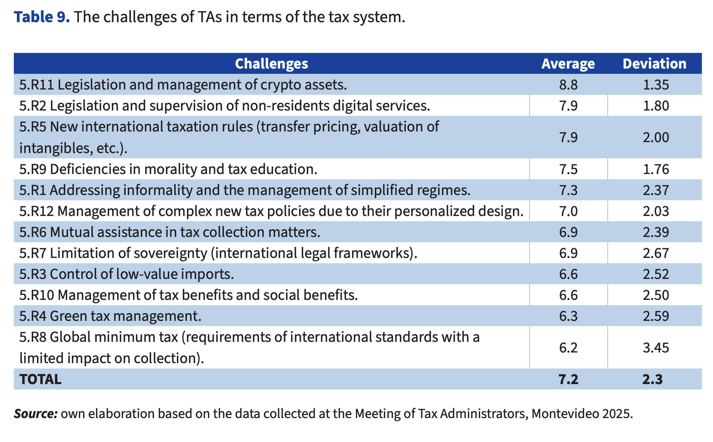 The most relevant challenges in this field are detailed in Table 9 (average 7.2; deviation 2.3) and ranked in the following order: legislation and management of crypto assets; legislation and supervision of digital services provided by non-residents; new international taxation rules; shortcomings in tax ethics and education; the informality and administration of simplified regimes; management of complex tax policies due to their tailored design; mutual assistance in tax collection; limitation on sovereignty (within international legal frameworks); oversight of low-value imports; management of tax and social benefits; management of environmental taxation; the global minimum tax.