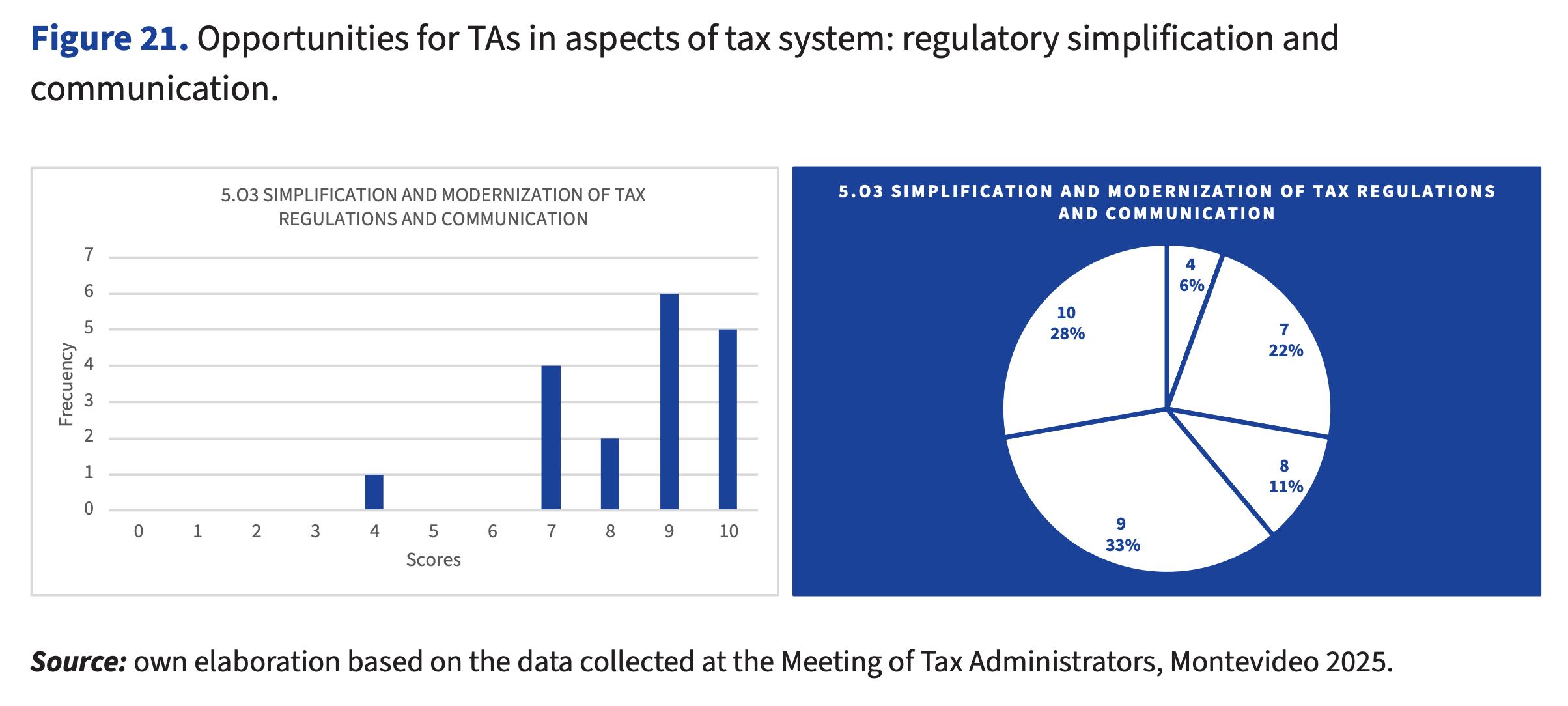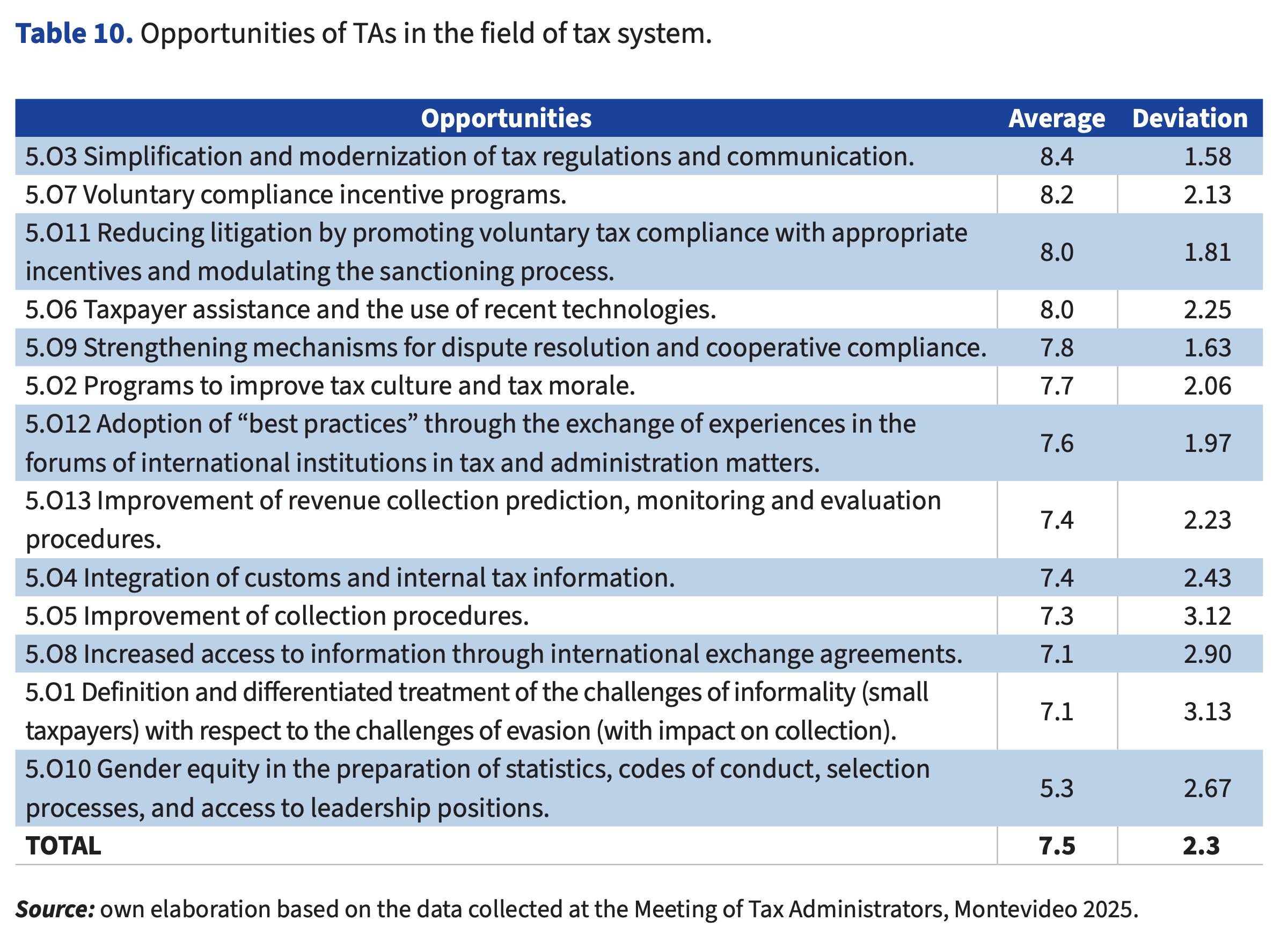 As for the opportunities in this area (Table 10; average 7.5; deviation 2.3) we find the following in order of scoring: simplification and modernization of tax regulations and communication; incentives for voluntary compliance; reduction of litigation and promotion of voluntary compliance; assistance to the taxpayer and use of new technologies; mechanisms for dispute resolution and cooperative compliance; improvement of tax culture and fiscal morality; adoption of “best practices” through the exchange of experiences in international institutional forums; forecasting, monitoring, and evaluation of revenue collection; integration of customs and internal tax information; collection procedures; international information exchange agreements; challenges of informality (small taxpayers) versus challenges of evasion (with an impact on collection); gender equality.