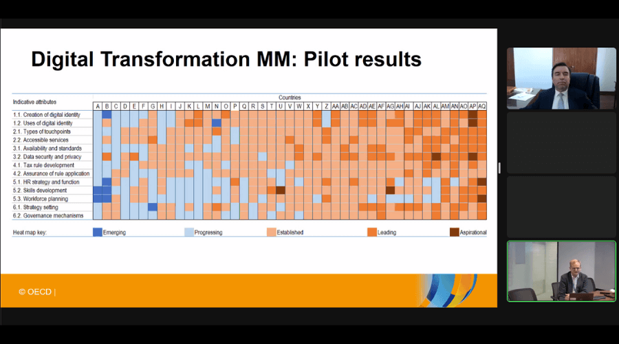 Luego, por parte de la OCDE, el Sr. Oliver Petzold realizó una presentación del documento Administración Tributaria 3.0 y el Modelo de Madurez de la Transformación Digital. Por último, del CIAT, el Sr. Santiago Díaz de Sarralde habló del informe de INDETEC